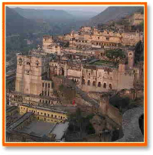 Travel Bundi Rajasthan City Palace & Fort - located beside the Kota Barrage, overlooking the Chambal River, thee City Palace and Fort is one of the largest such complexes in Rajasthan. Some of its buildings are now occupied by schools, but most of the complex is open to public. Entry to the complex is from the south side through the Naya Darwaza or New Gate. The palace within contains some striking buildings with delicate ornamental stonework. The Hathi Pol (Elephant Gate) decorated with more recent murals, shows a royal wedding procession, while the Hawa Mahal (Palace of Winds) is modelled on the one in Jaipur. The Bhim Mahal, an early 18th century Durbar Hall, is covered with Rajput miniature paintings documenting the town's history and local legends. Also within the palace is the Rao Madho Singh Museum which has a fine collection of weapons, old costumes, stuffed beasts and some of the best preserved murals in the state.